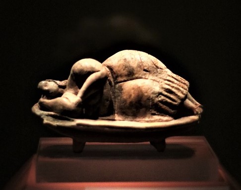 In many of the megalithic temples as well as in the burial grounds of the Hypogeum and the Xagħra Circle on Gozo, there were found a significant number of tiny figurines, in the human and animal shape as well as tiny representations of water or food vessels. These statuettes were often made of clay but sometimes of other material. The true meaning of these handmade objects is uncertain, but many agree that each of these objects was presented to the temple priests as a kind of an inexpensive gift, an ex voto of sorts, a reminder and appreciation for a grace received. Some were discovered close by to the so called ‘Oracle Hole’ of the Tarxien Eastern Temple (Temple number 2). Similarly, inside the Hypogeum, small figurines, amongst which, the famous ‘Sleeping Lady’, were also found inside one of the pits. The latter too must have been left behind as an ex voto. In this instance, this figurine might have well represented a sick woman who was brought into the underground man-made caves on a litter in order to seek to be cured by the priest or shaman officiating there. Then again, the donor of the statuette might have wanted to invoke the spiritual powers of the ‘Mother Earth’ for her to be cured. Some scholars even suggest that the effigy of this reclining figure might also reflect the act of communicating with the dead through dreams when she slept inside one of the chambers.