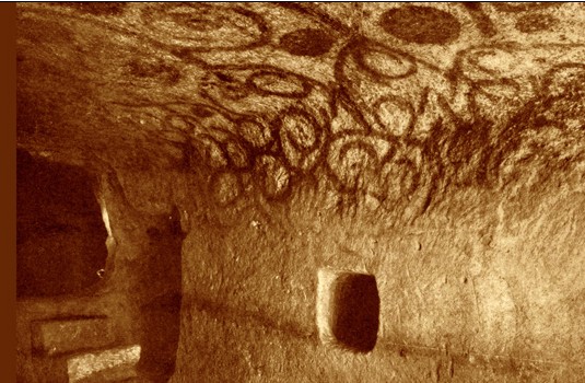A similar spiral design, albeit painted in ochre which perhaps merits a somewhat different interpretation was drawn on the ceiling and side walls of the so called ‘Oracle Chamber’ within the underground cemetery of Paola, known as the Hypogeum. This time the spiral curls into ‘branches’ that have ‘fruit’ attached to them. One wonders what sort of fruit these were. Pomegranates maybe? Just like snails, the pomegranate also matures and is ready for harvesting in the first months of the rainy seasons. The same fruit also features in the fertility tale of Persephone of Greek mythology. Thus in the context of the underground burial chambers of the Hypogeum, the spiral might hint at the spiritual aspirations of man in the resuscitation of all those deceased and buried in the womb of mother earth.