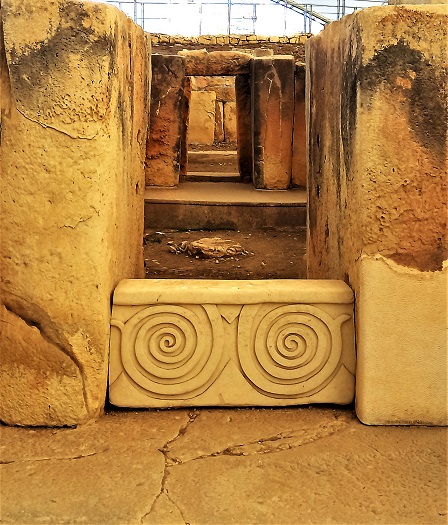 Then there was the spiral motif that seems to have been created and replicated during the later phase of the temple period. In the Southern Temple of Tarxien the spirals are very elaborately executed in a more sophisticated manner on almost every stone block that formed part of the altars. In one instance there is a pair of spirals that stand alone in the Tarxien Central Temple. The stone block on which these are depicted seems to have purposely been positioned to bar access to the inner and sacred part of the temple. These spirals in particular have been interpreted differently as they recall a pair of eyes in stylised form that were meant to guard the sanctuary.