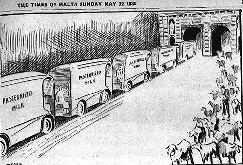 Following Zammit’s discovery, British soldiers were no longer being supplied with goats’ milk and thus, in a short while the military was no longer being exposed to such infections. ** The Maltese were warned not to consume fresh milk. Such information was relayed to the largely illiterate population, mainly from the pulpits of churches where the Maltese congregated daily (Ganado, 1974). The warnings to the Maltese had only minor success. While some desisted from purchasing fresh milk from herdsmen and opted to consume tinned milk most others, especially those in the rural areas simply ignored the warnings. Along the years, various awareness campaigns were launched to slow down and eradicate the transmission of the microbe to humans from infected milk, but for the most part, the infections from Brucellosis remained high. As from 1932, the authorities pushed actively for pasteurisation and herdsmen were now required to take their goats to milking stations in Ħamrun, San Ġwann and Tarxien (J. Arena, 2021). It was only in 1938, that a law to have all milk be pasteurised came into force. In so doing, the small herds of goats vanished altogether from the streets of the Maltese towns and villages.