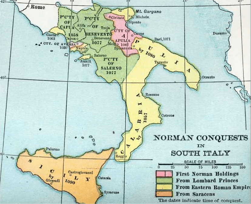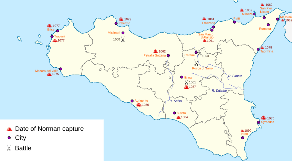 Following the fall of Palermo, Robert Guiscard conferred the title of Count of Sicily to Roger, although Robert retained the territories surrounding Messina (Valdemone and San Marco) under his control. When Robert died in 1085, Roger, returned to Apulia to settle disputes between Robert’s two sons over their father’s inheritance. As it turned out, Roger was to take over the regions of Apulia and Calabria.