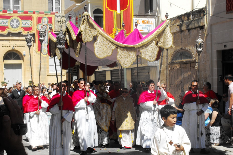 CORPUS CHRISTI Dan hu l-isem tal-festa li tiċċelebra l-Knisja Kattolika f’ġiħ l-Ewkaristija. Il-kliem Latin ifisser il-’Ġisem ta’ Kristu.’ Din hi waħda mill-eqdem festi ċċelebrati f’Malta, għaliex insibuha ddokumentata anke f’nofs is-seklu erbatax. Fi żmien l-Ordni, il-Gran Mastru u l-Kavallieri kienu jiċċelebrawha billi jieħdu sehem f’purċissjoni li kienet issir. Fil-festa ta’ Corpus, iċ-ċelebrant, jimxi fit-toroq tal-lokal bl-ostensorju f’idu, akkumpanjat mill-fratellanza u abbatini. Dari, ir-residenti tal-parroċċa kienu jifirxu t-twapet ħomor tad-djar tagħhom fit-triq, u jitfgħu l-fjuri mal-art, bħala sinjal ta’ rispett lejn l-ostja li ċ-ċelebrant ikun qiegħed iġorr.